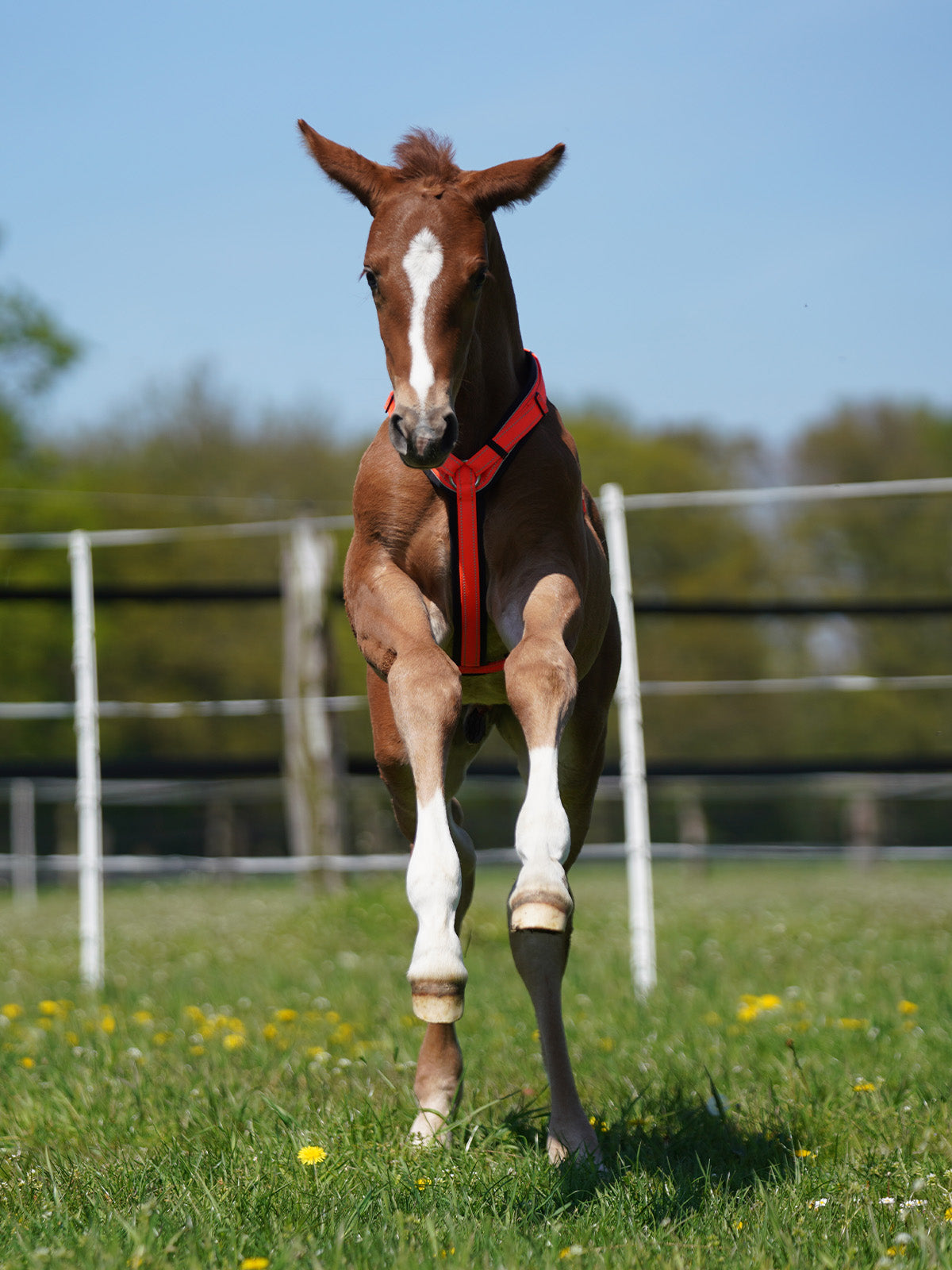 Entstanden ist die Idee unseres Fohlengeschirrs aus einem verletzten Fohlen einer SPRENGER Mitarbeiterin. Nach einem Leistenbruch direkt nach der Geburt, einer notwendigen OP und einem Klinikaufenthalt sollte