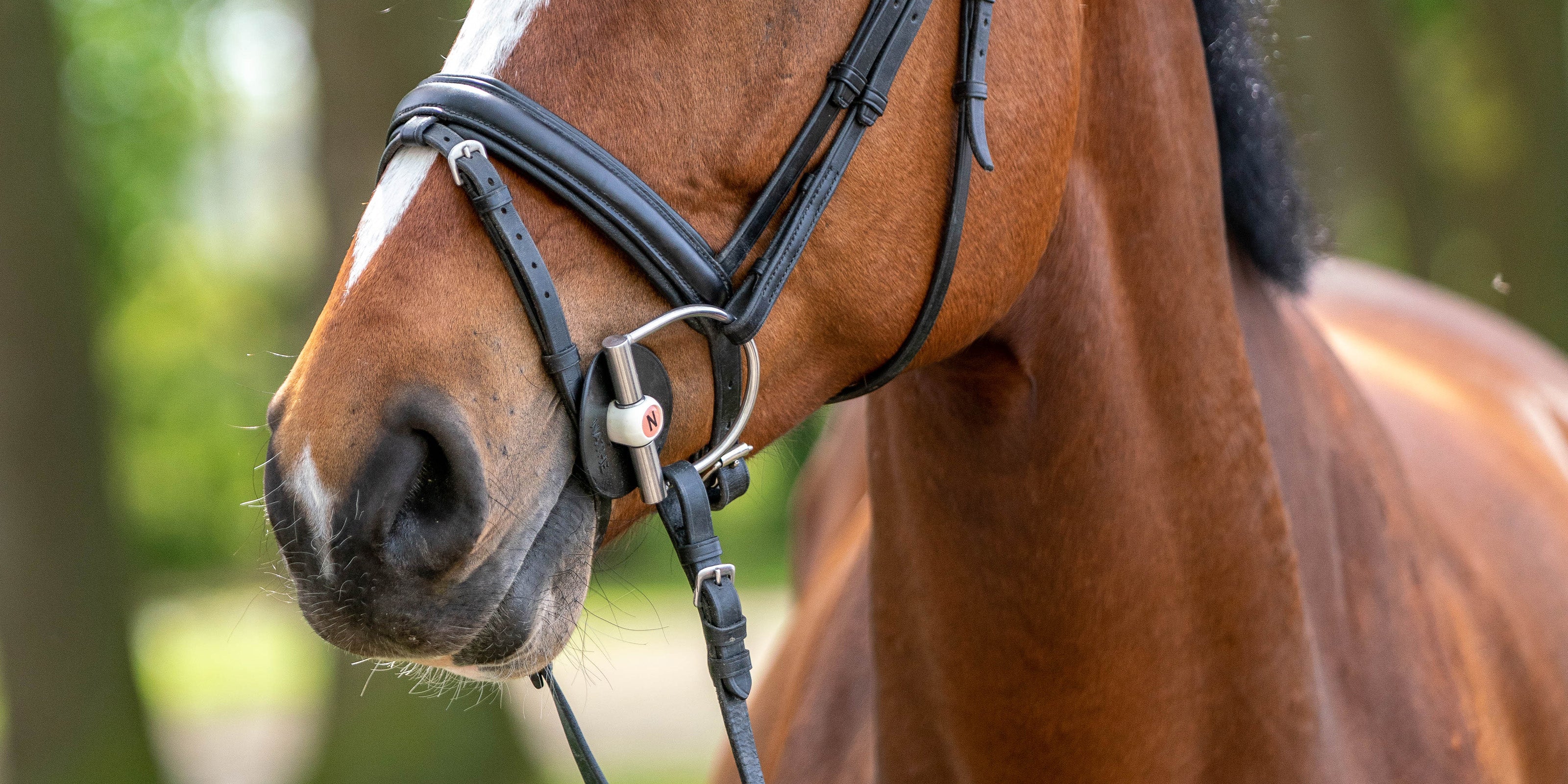 Wie bisher sind die Mundstücke außen an den Enden jeweils mit einem rosafarbenen "N" gekennzeichnet. Eines davon ist zusätzlich mit einem kleinen Pfeil versehen. Das Gebiss ist korrekt eingeschnallt, wenn dieser Pfeil auf der linken Hand nach vorne zeigt.